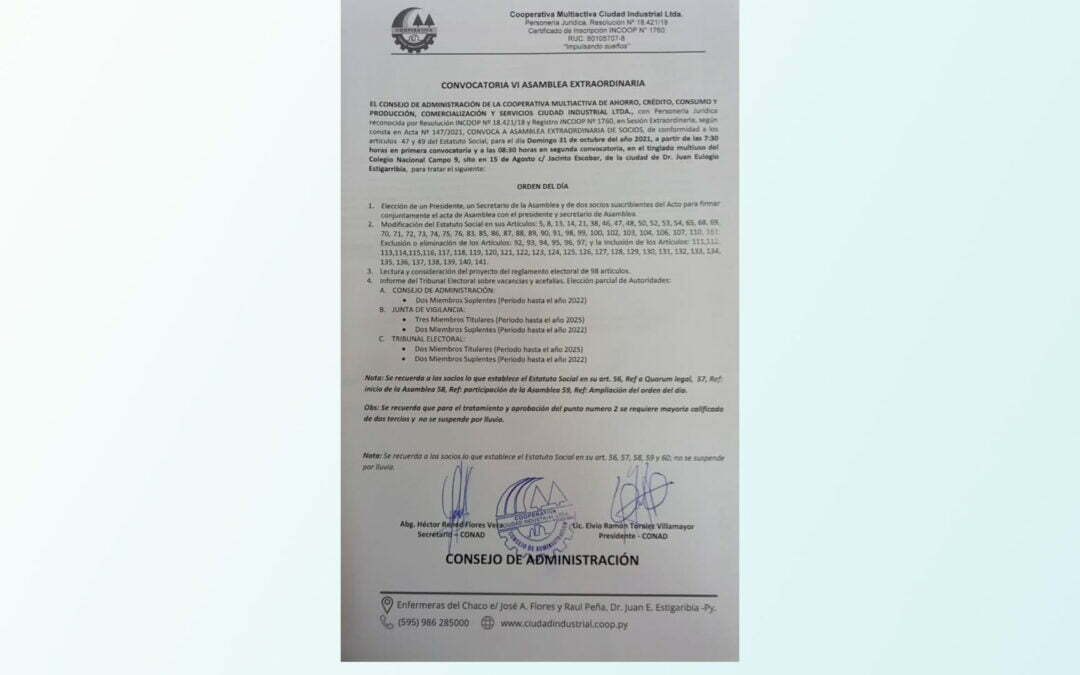 El Consejo de Administración de la Cooperativa Ciudad Industrial Ltda. en Sesión Extraordinaria, según consta en Acta N° 147/2021 convoca a Asamblea Extraordinaria de Socios, de conformidad a los artículos 47 y 49 del Estatuto Social, para el día Domingo 31 de octubre del año 2021, a partir de las 7:30 horas en primera convocatoria y a las 08:30 en segunda convocatoria, en el tinglado multiuso del Colegio Nacional Campo 9, sito en 15 de agosto c/ Jacinto Escobar, de la Ciudad de Dr. Juan Eulogio Estigarribia, con el orden del día detallado en el documento original que compartimos a continuación: